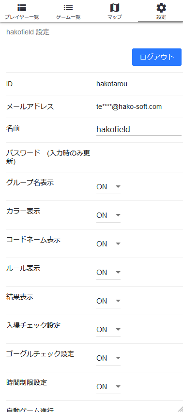 | 自動ゲーム進行 | 入場チェック、ゴーグルチェック、ゲーム結果判定を自動で行うかどうかを設定します。 |
